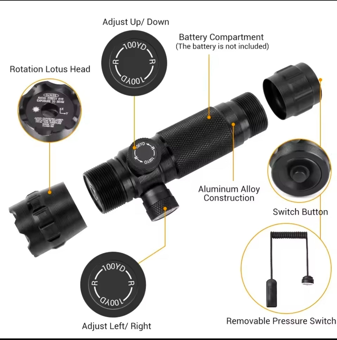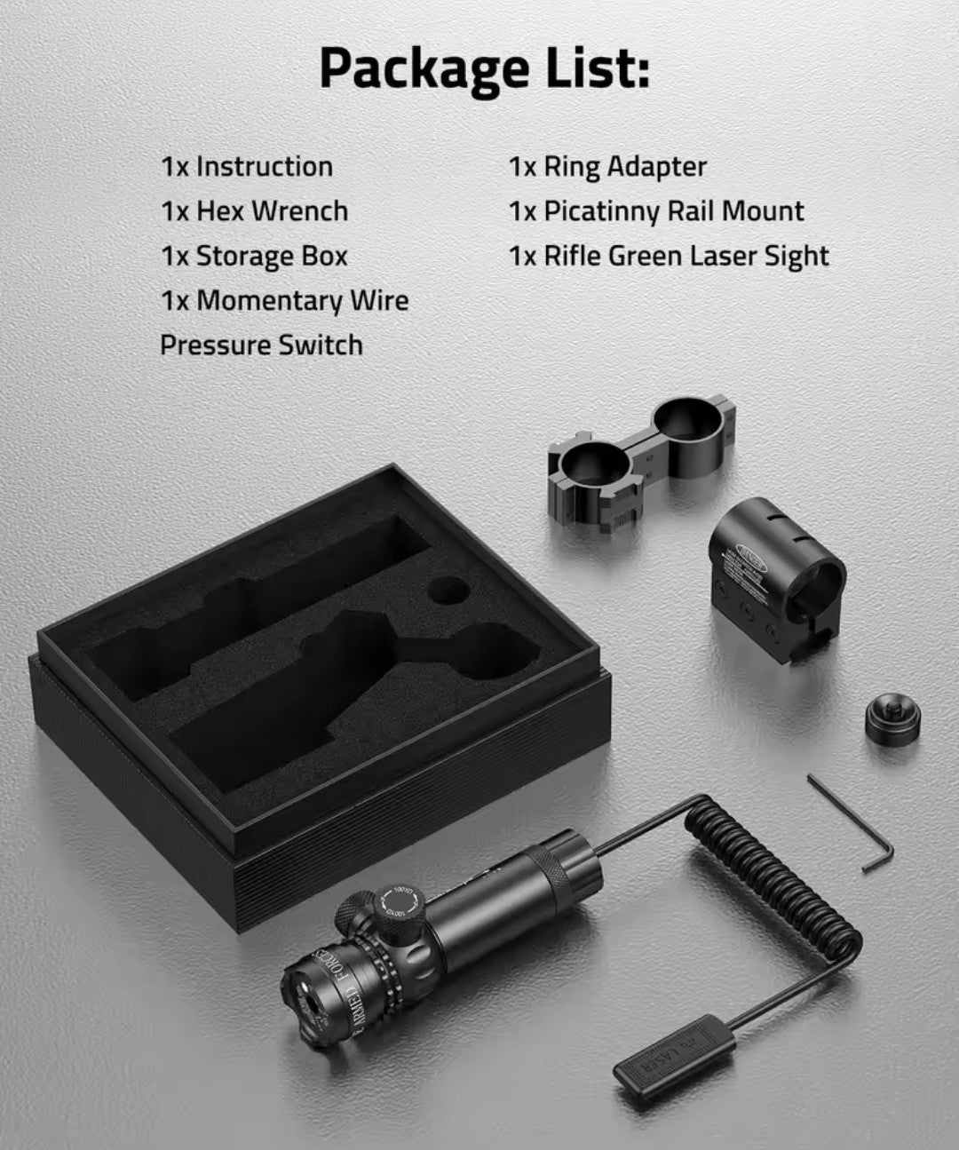 Powerful laser sight with high visibility (532nm) for accurate targeting up to 300m. Built from durable aerospace-grade aluminum with hard anodized finish, suitable for demanding conditions.